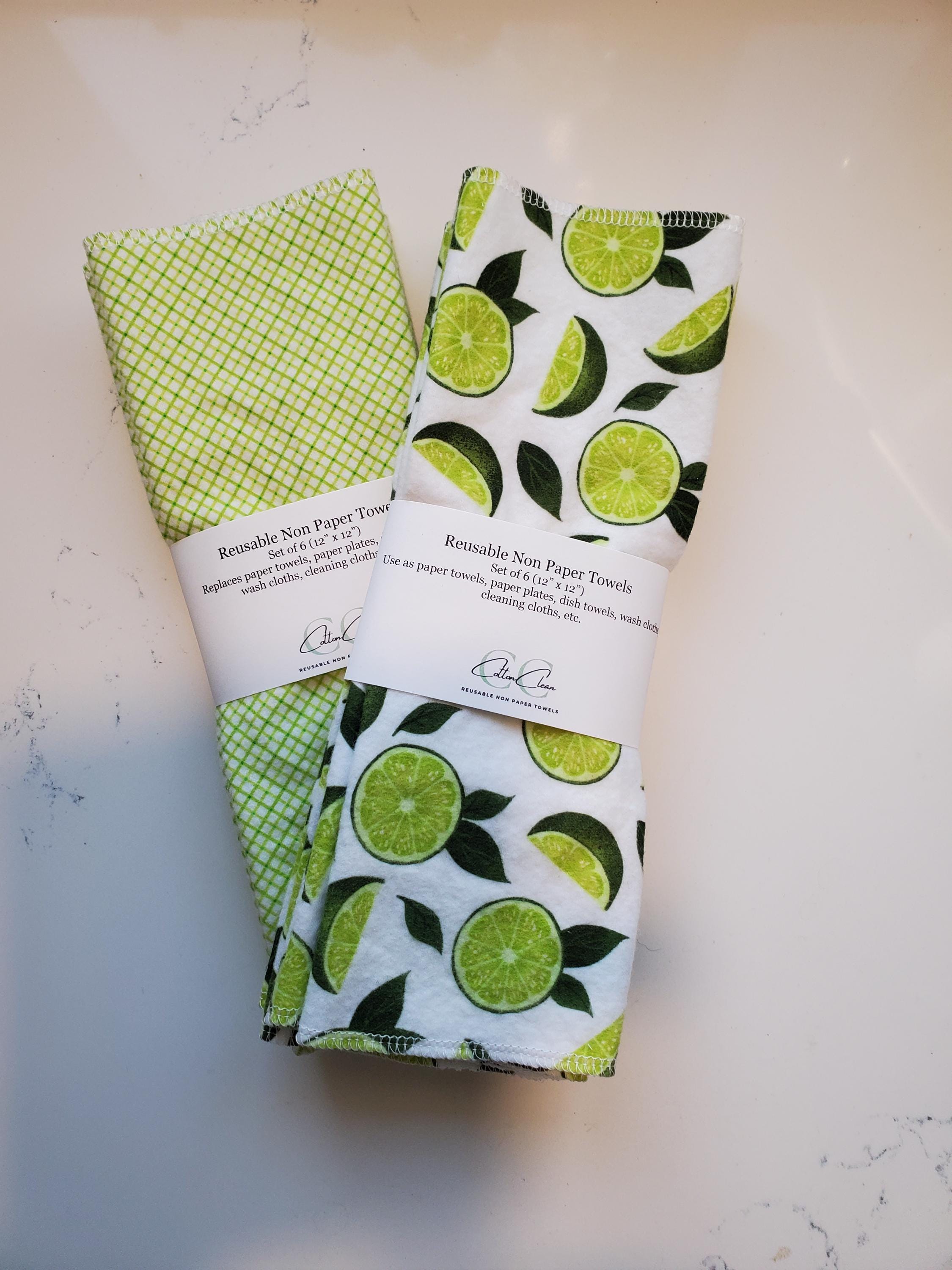 Each towel is one-ply high-quality 100% cotton flannel. I have rounded the edges and used an overlock stitch to help prevent fraying. I have already washed and dried this material before cutting the towels, so there should be little to no shrinkage. The towels / napkins become softer and more absorbent with each wash. I just toss the used non-paper paper towels into my washing machine and they get washed with whatever load of laundry is next. I dry them with the same load of clothes. Please don't use chlorine bleach or fabric softener.