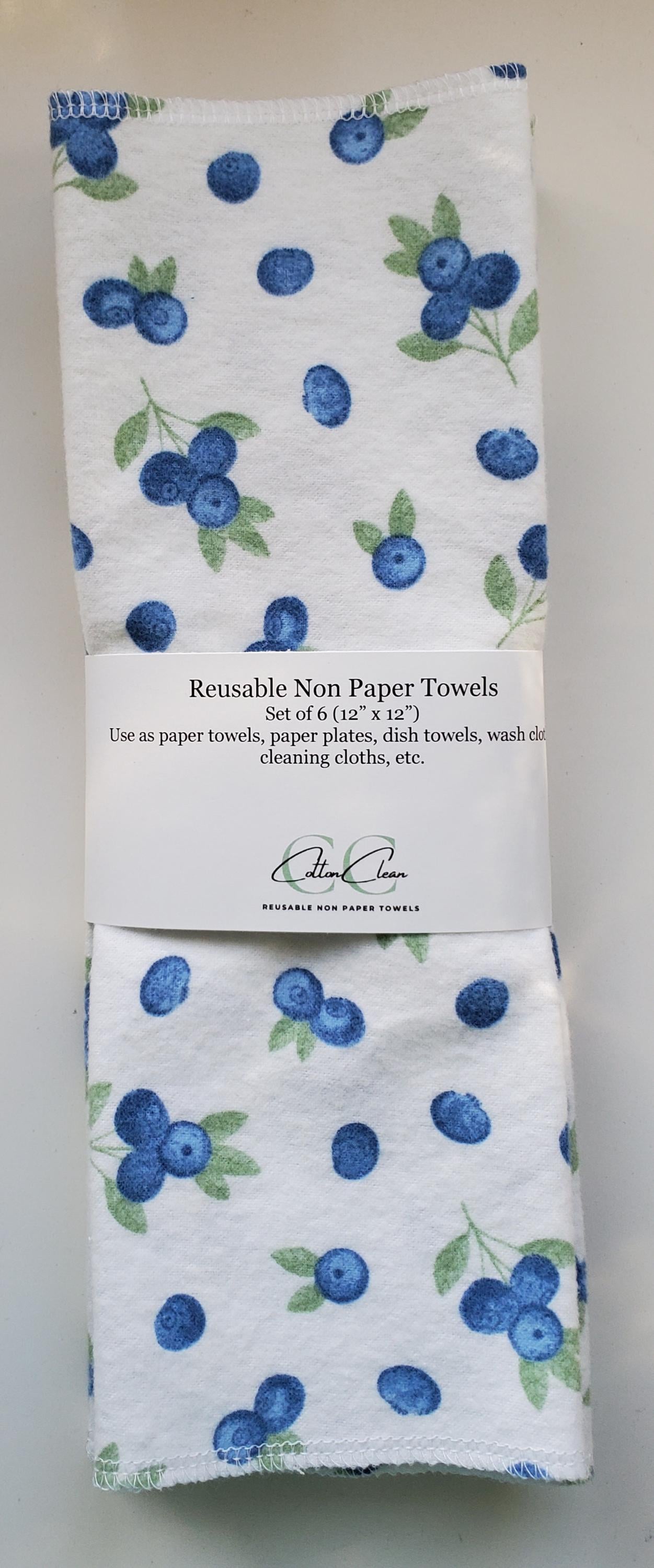 Each towel is one-ply high-quality 100% cotton flannel. I have rounded the edges and used an overlock stitch to help prevent fraying. I have already washed and dried this material before cutting the towels, so there should be little to no shrinkage. The towels / napkins become softer and more absorbent with each wash. I just toss the used non-paper paper towels into my washing machine and they get washed with whatever load of laundry is next. I dry them with the same load of clothes. Please don't use chlorine bleach or fabric softener.